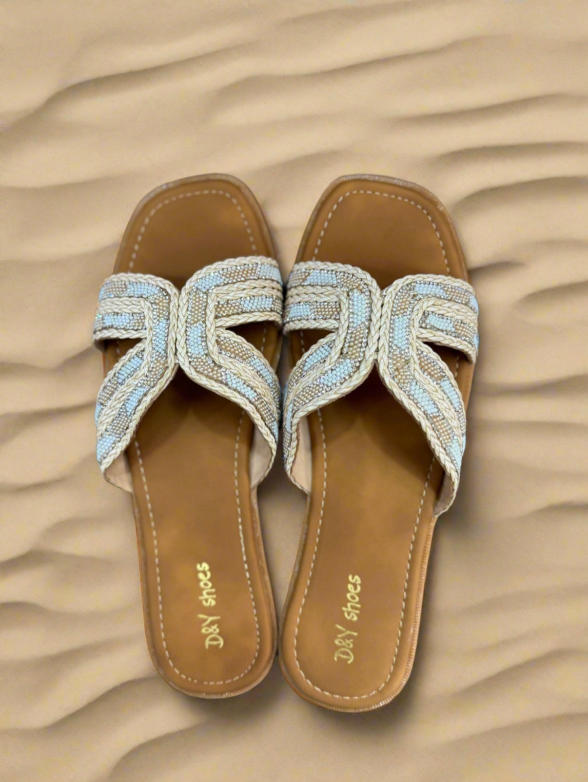These are comfy flat sandals with cool braided straps. The straps are made of white and beige beads woven together in a criss-cross design. The bottom part is a nice tan color. They are easy to slip on and perfect for wearing every day, especially when you want to feel relaxed and stylish.